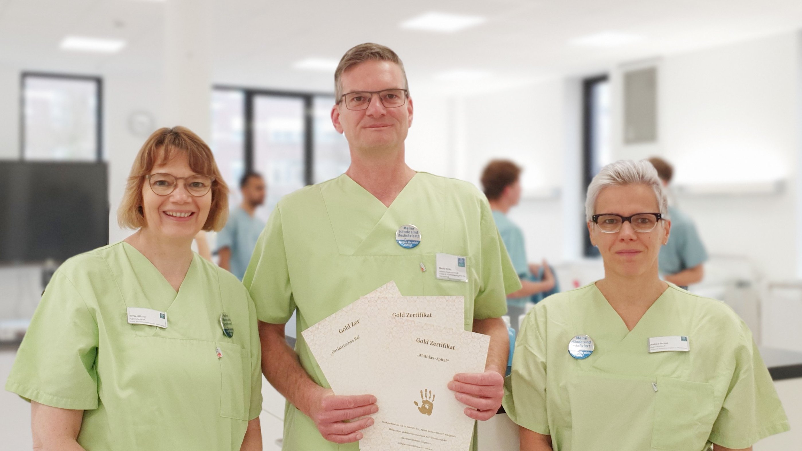 Die Krankenhäuser der Mathias-Stiftung – Klinikum Rheine, Klinikum Ibbenbüren und das St.-Elisabeth-Hospital als geriatrische Rehabilitationsklinik in Mettingen – haben mit großem Erfolg die Anforderungen der Aktion Saubere Hände erfüllt. Das Klinikum Rheine und das Klinikum Ibbenbüren wurden erneut mit dem begehrten Gold-Zertifikat ausgezeichnet. Hervorzuheben ist, dass das St.-Elisabeth-Hospital in Mettingen von Silber auf Gold aufgestiegen ist und nun ebenfalls mit dem höchsten Standard zertifiziert ist.